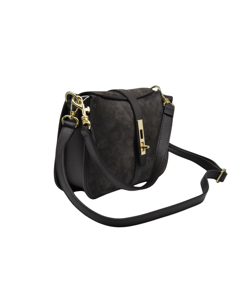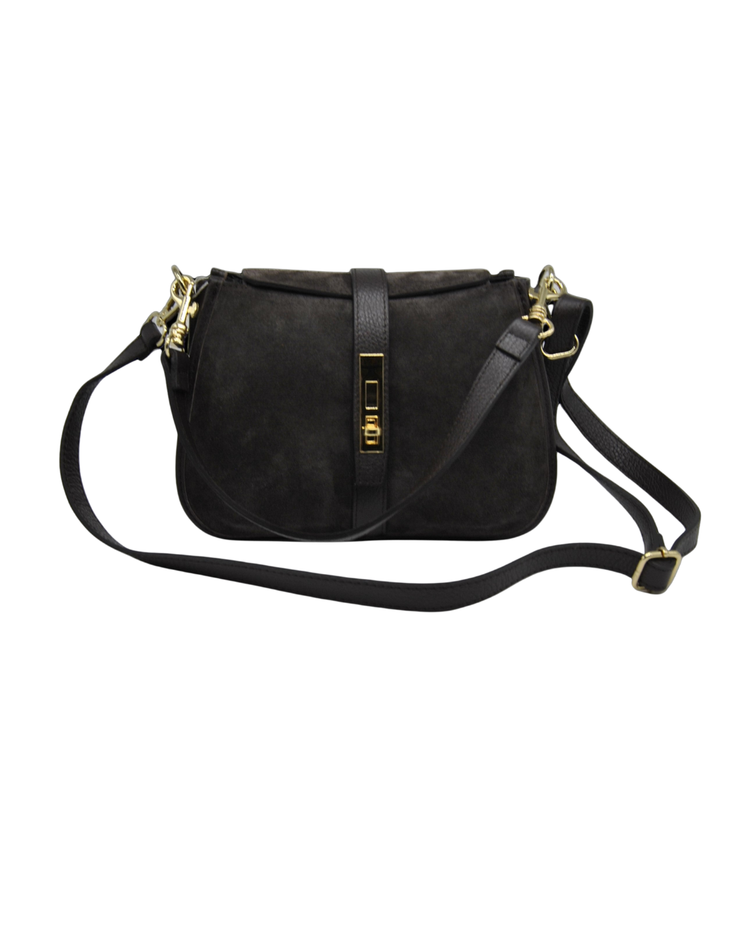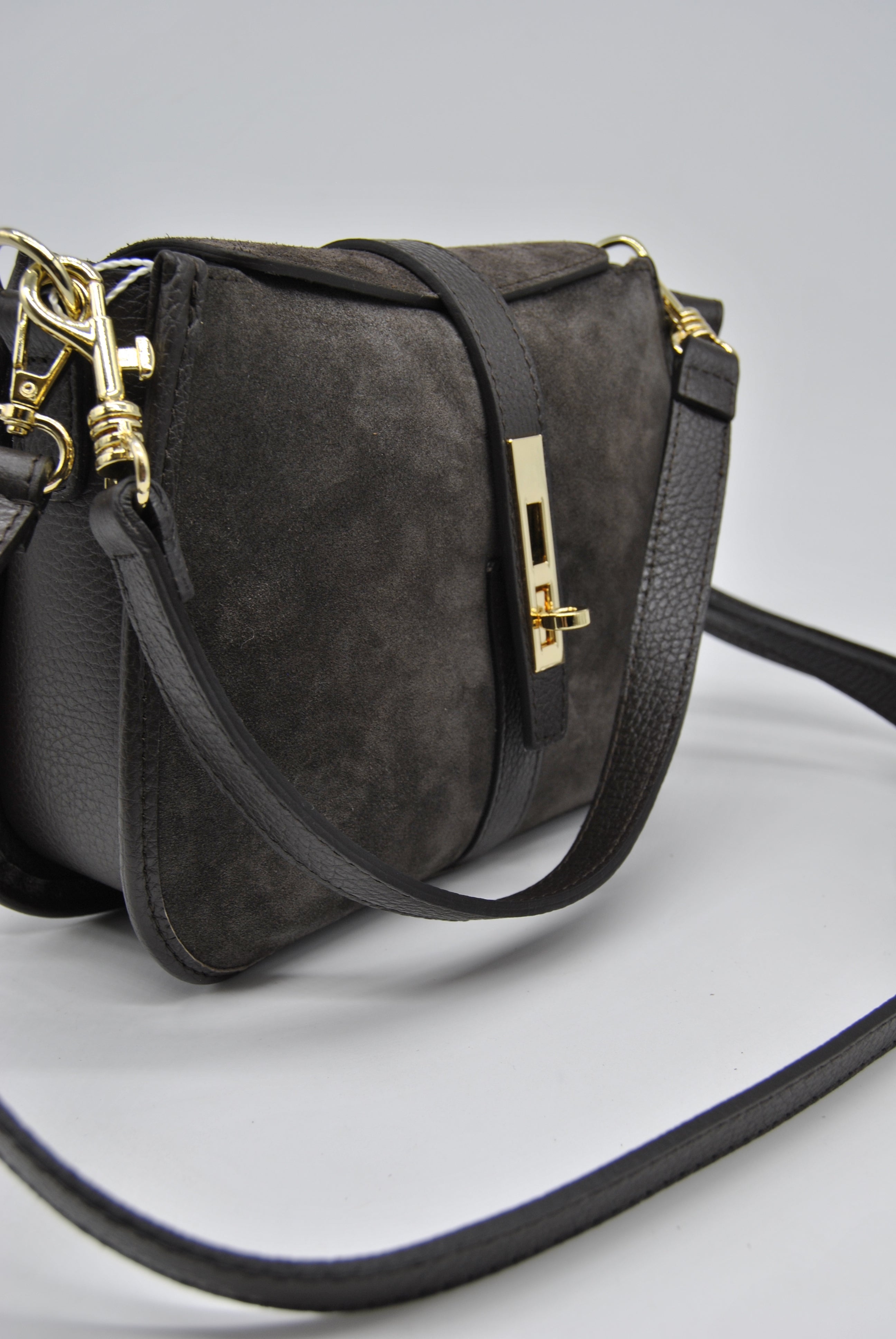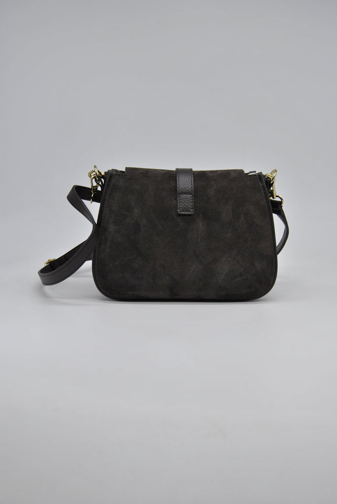 Sac en daim sur la partie avant et arrière, avec des empiècements en cuir.