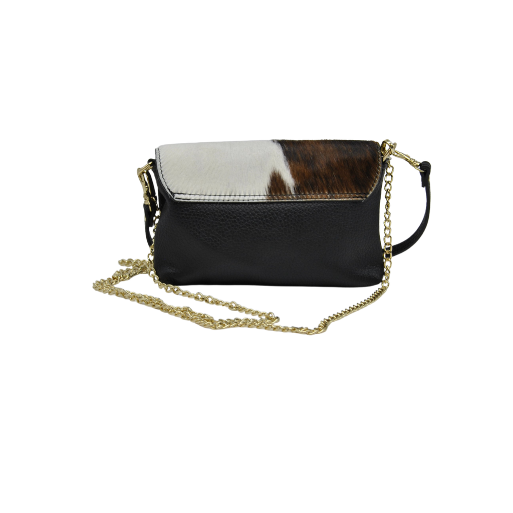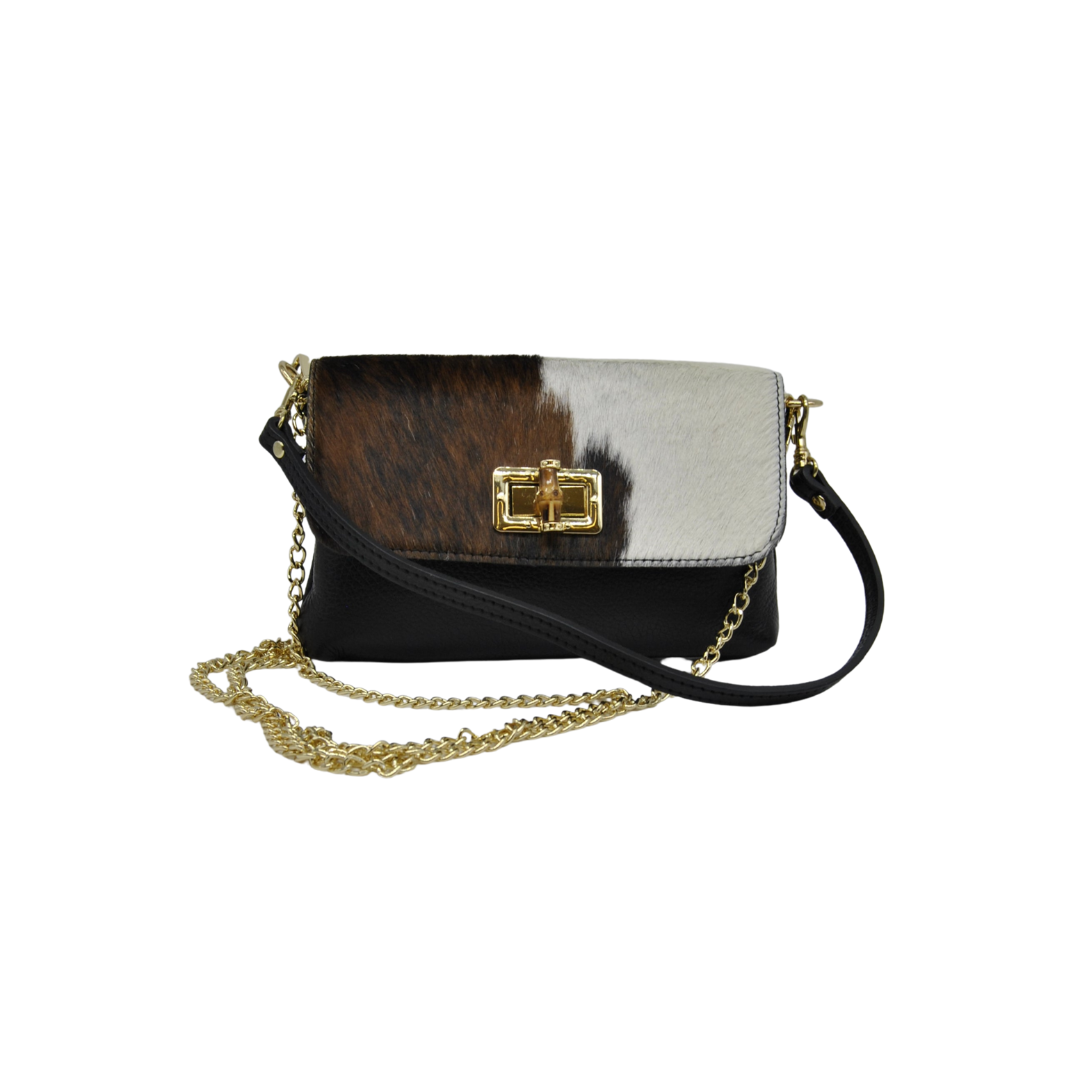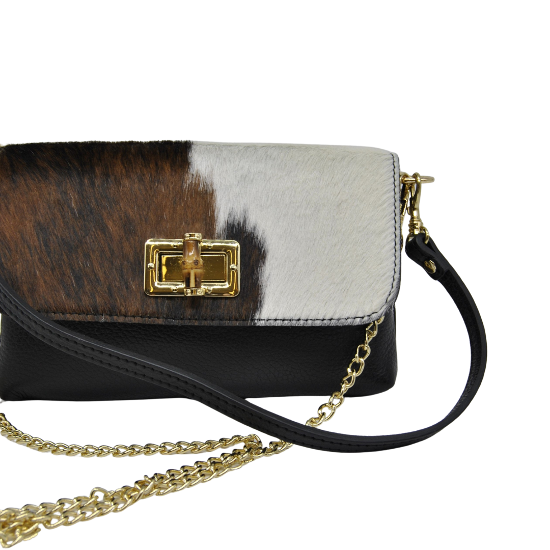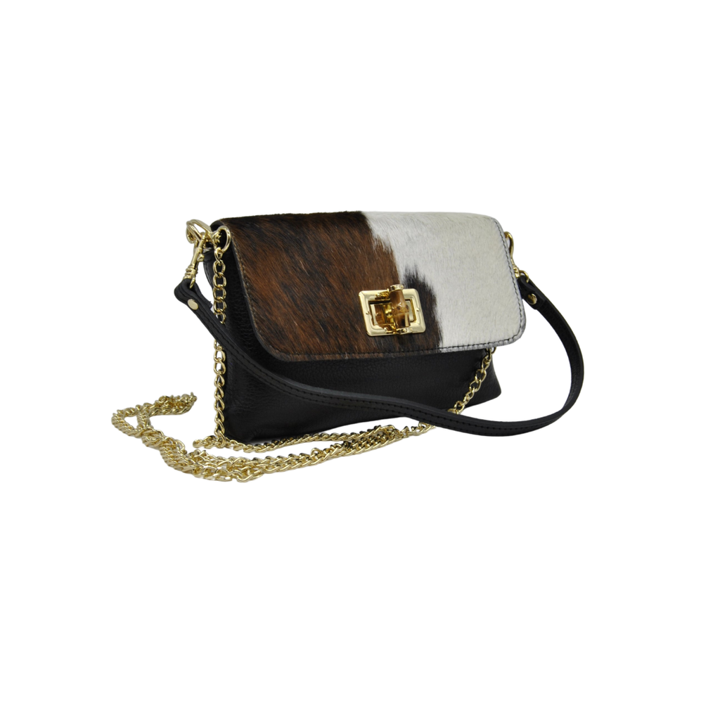 Fermeture avec accessoire, poignée en cuir et bandoulière chaîne amovible.