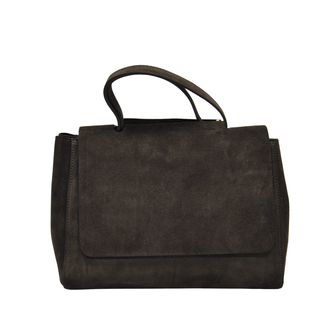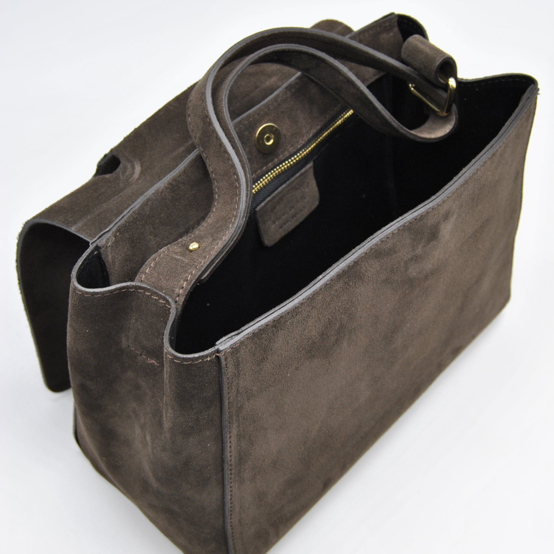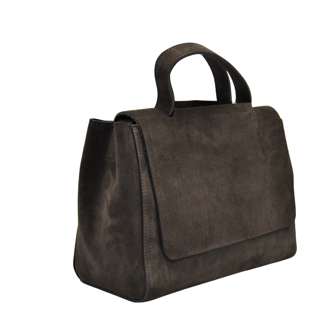 Sac en daim, avec rabat et fermeture à bouton pression dissimulé.