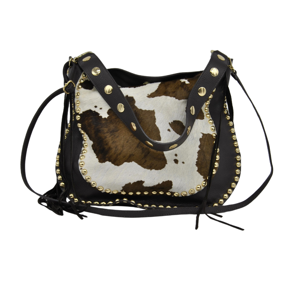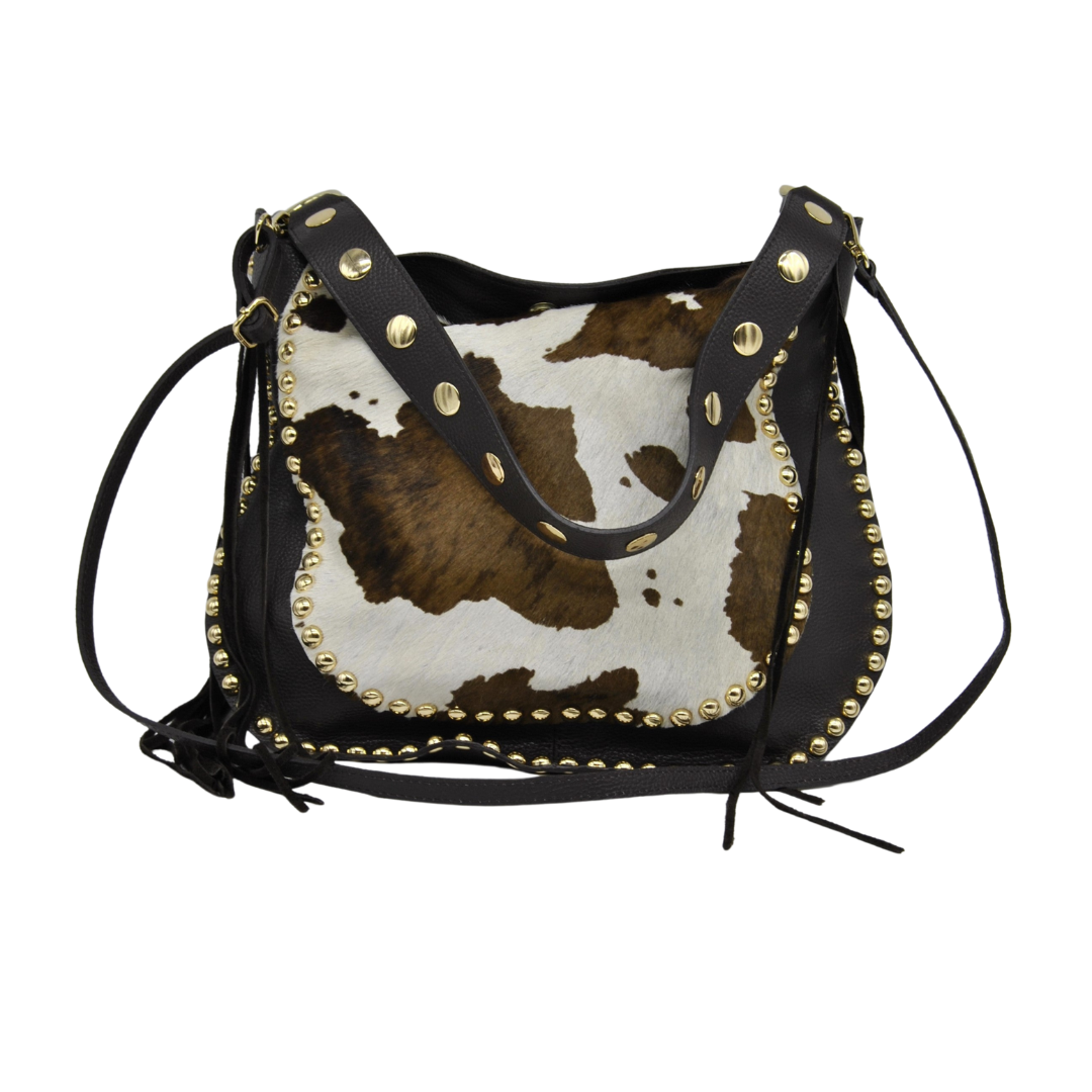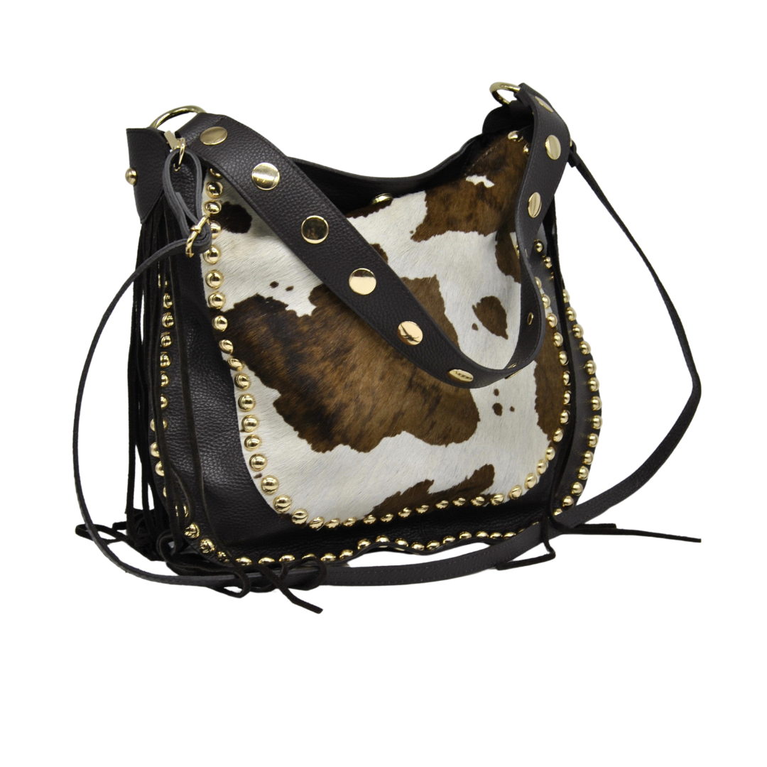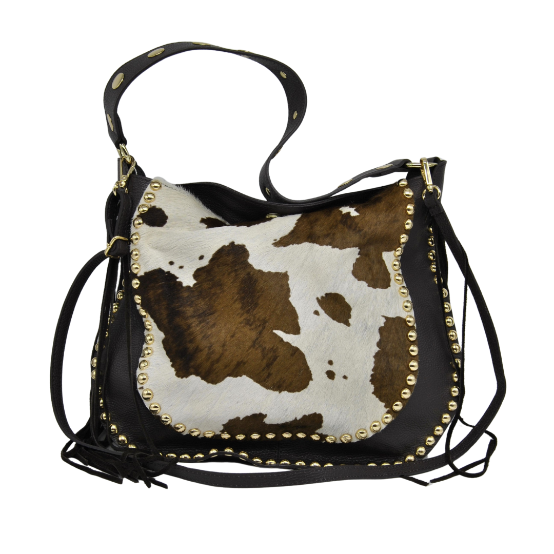 Sac imprimé animal vache à l’avant avec clous et cuir, tout cuir à l’arrière.